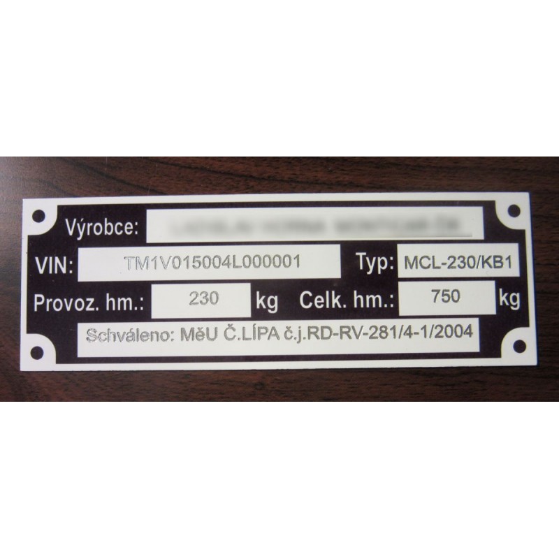 Hliníkový štítek s potiskem, údaje jsou vygravírované.